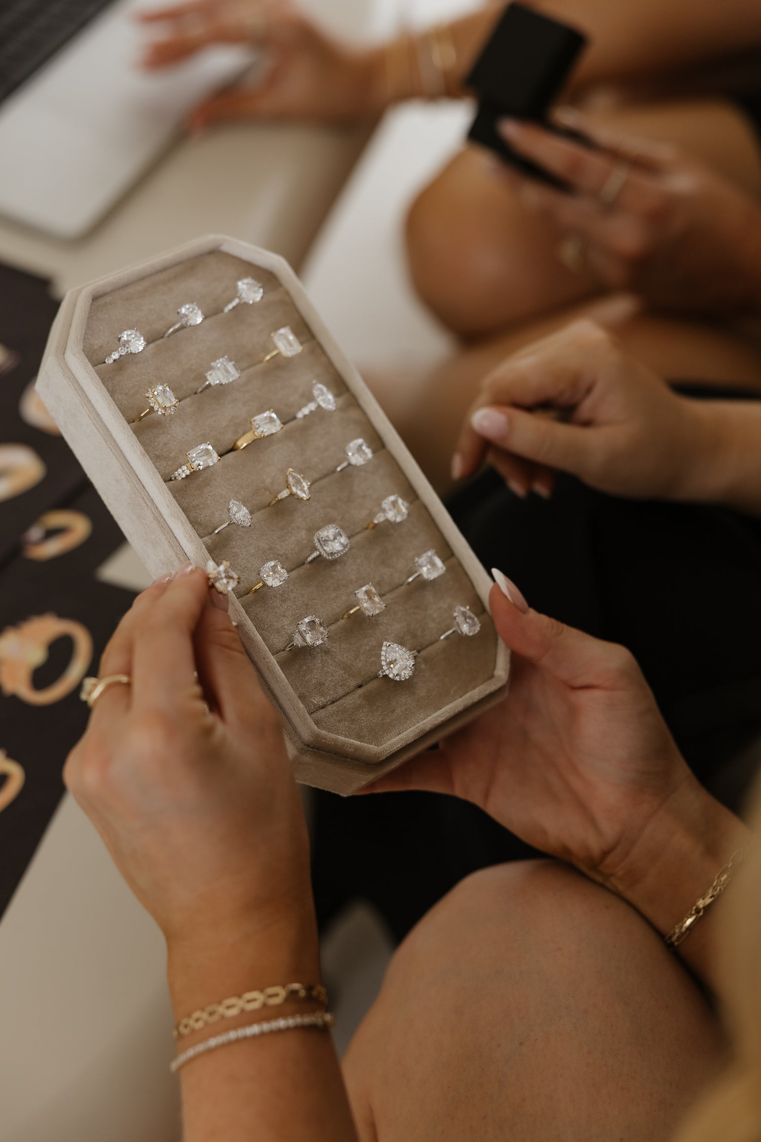 For those who prefer a more interactive experience, we offer an In-Person Diamond Viewing at our Chandler, Arizona office ($150 Diamond Sourcing Deposit required). This is a private appointment where we curate and bring in hand-selected loose diamonds and sample jewelry pieces for you to view, try on, and compare in person. The $150 deposit goes toward your purchase, and is non-refundable.